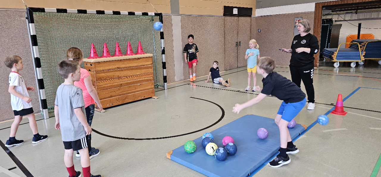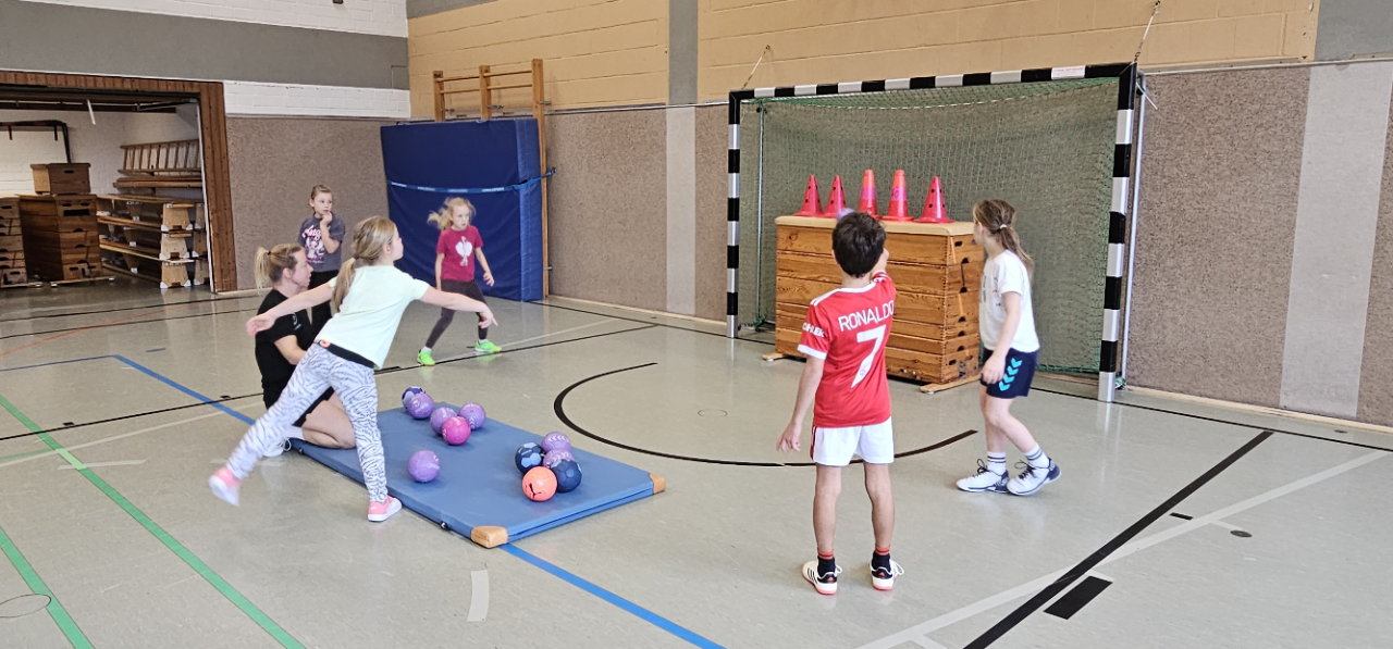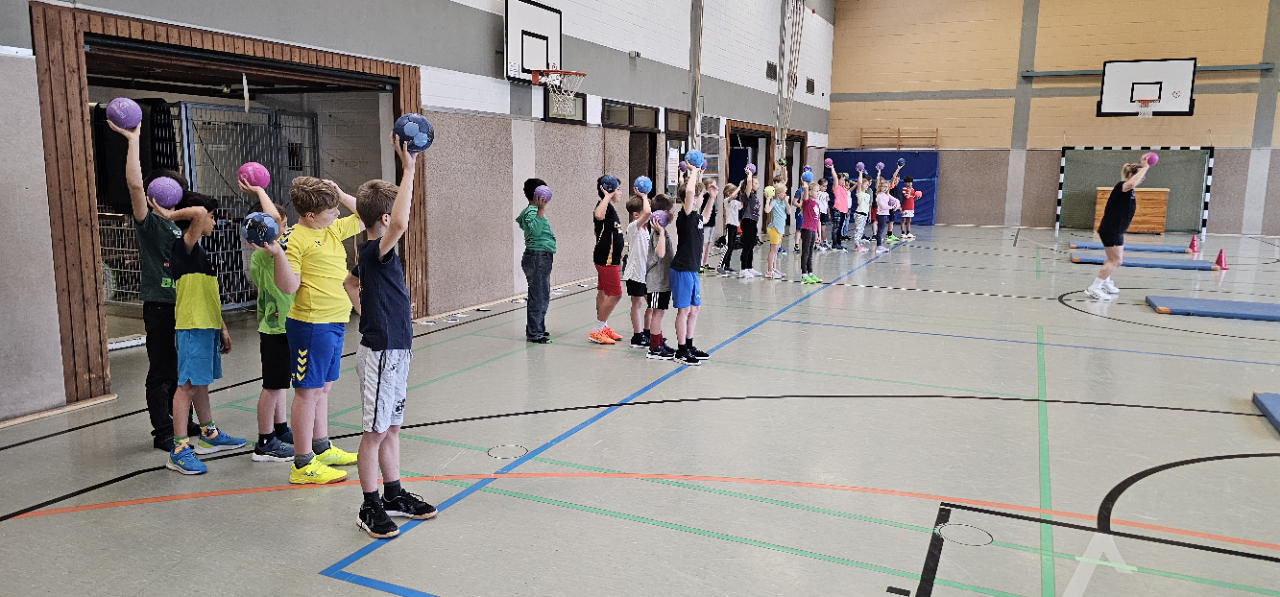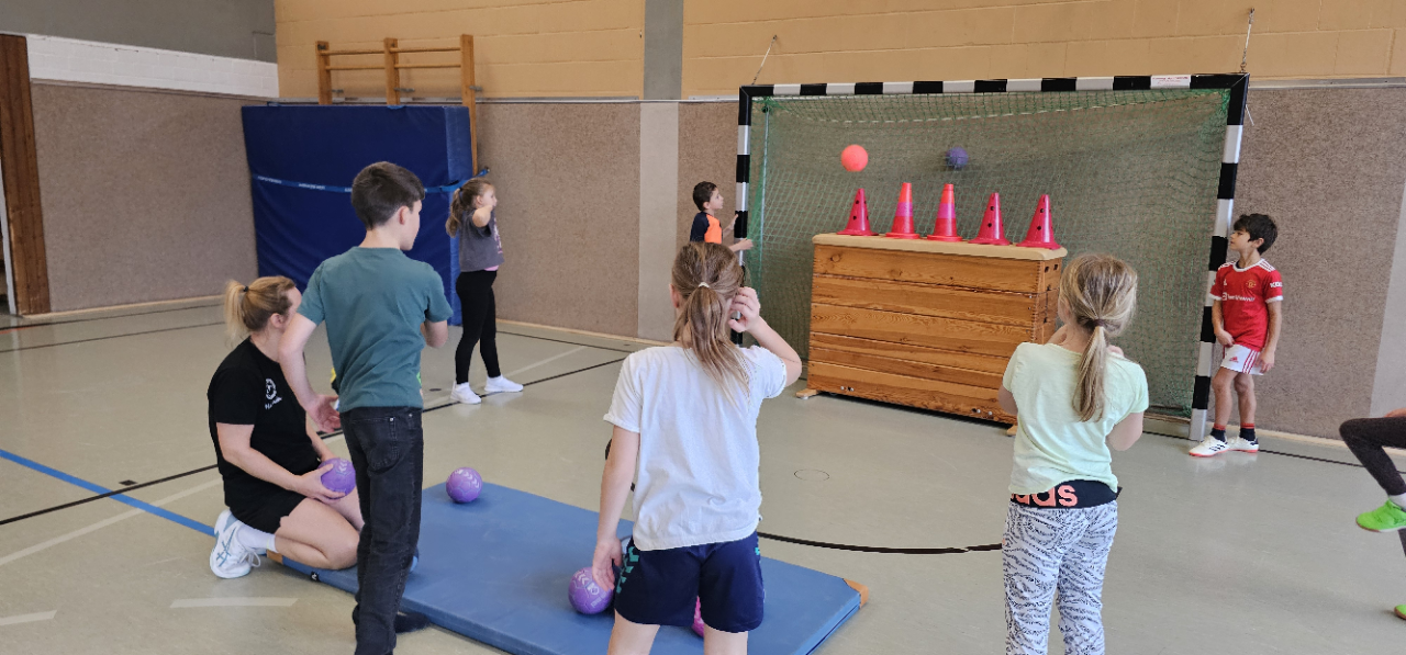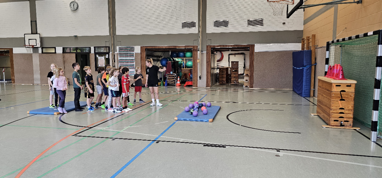 Angela Beckers-Rützel und Hannah Evers besuchten unsere dritten Klassen und ermöglichten den Kindern einen Einblick in die Handballwelt. Die Kinder waren mit unglaublich viel Elan, Motiviation und Freude dabei. Nach einem kurzen Warm-up unter dem Motto „Alles dreht sich um den Ball“ konnten die Hagelkreuzer an verschiedenen Stationen Übungen zum Werfen, Fangen, Hochwerfen, Laufen, Zielwerfen und Prellen erproben.